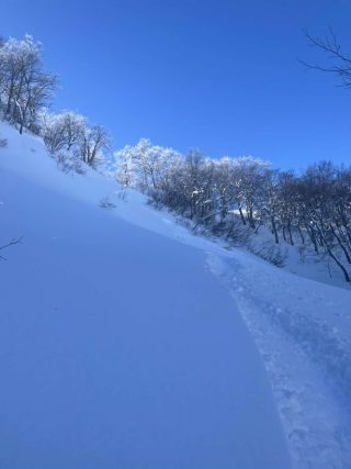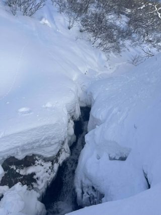 アルプス第11ペアリフト終点積雪250cm ルート下部は雪が少なく沢が見えている箇所が多数あります。